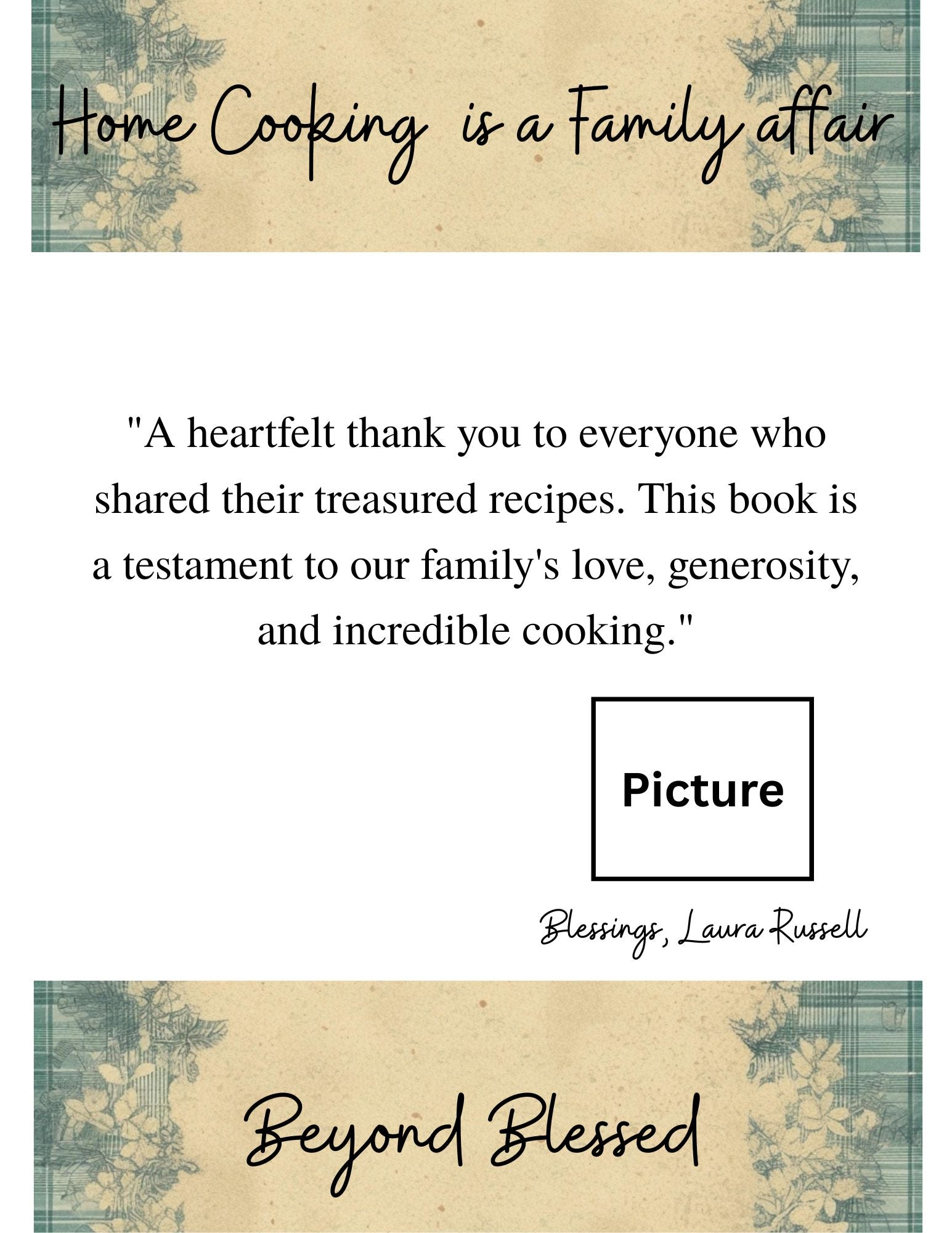 Unlock the heart of family traditions with own Family Custom Spiral Bound Cookbook, Filled with a collection of cherished recipes passed down through generations. From the secret ingredient in grandma’s signature pot roast to the sweet treats shared at every holiday gathering, these cookbooks are more than just a collection of ingredients and instructions—it's a taste of your family history. You can CUSTOMIZE these to your liking. Pick a cover, include photos and your own personal messages.. Size 8 1/2 x 11. Heavyweight 40lb project paper. Each Cookbook has a Cover page, Table of Contents, Introduction page, up to 75 recipe pages, Conclusion page, and Back Cover. You can include family photos as well!