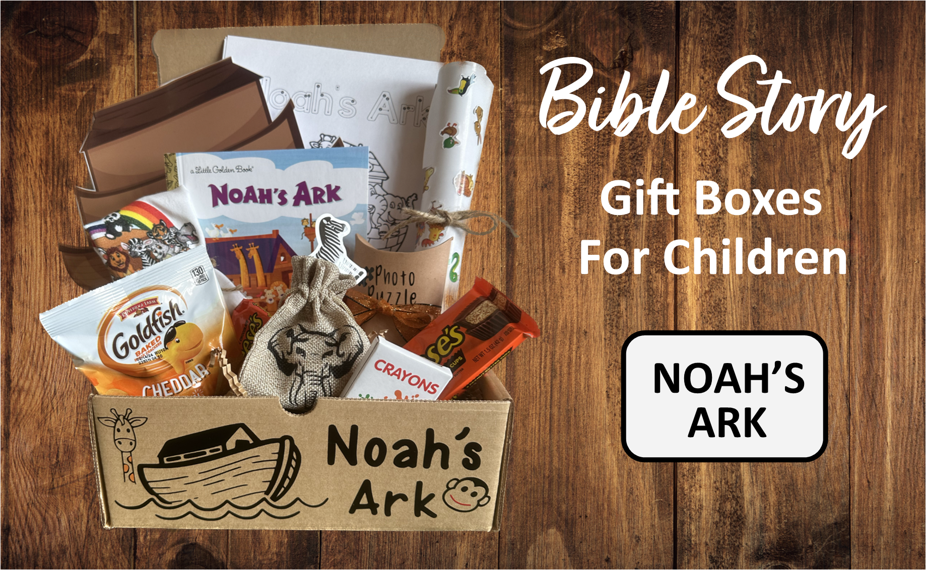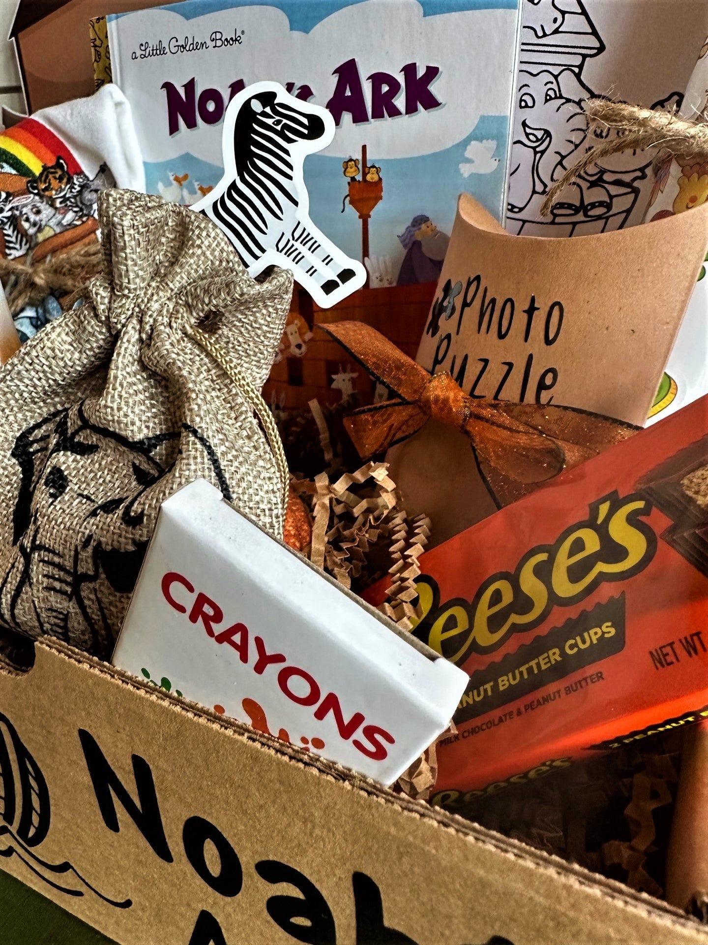 NOAH’S ARK Box Includes: Noah's Ark Book, Photo Puzzle, Activity Pages, Coloring Page, Canvas Bag with Stickers, Crayons and Candy.