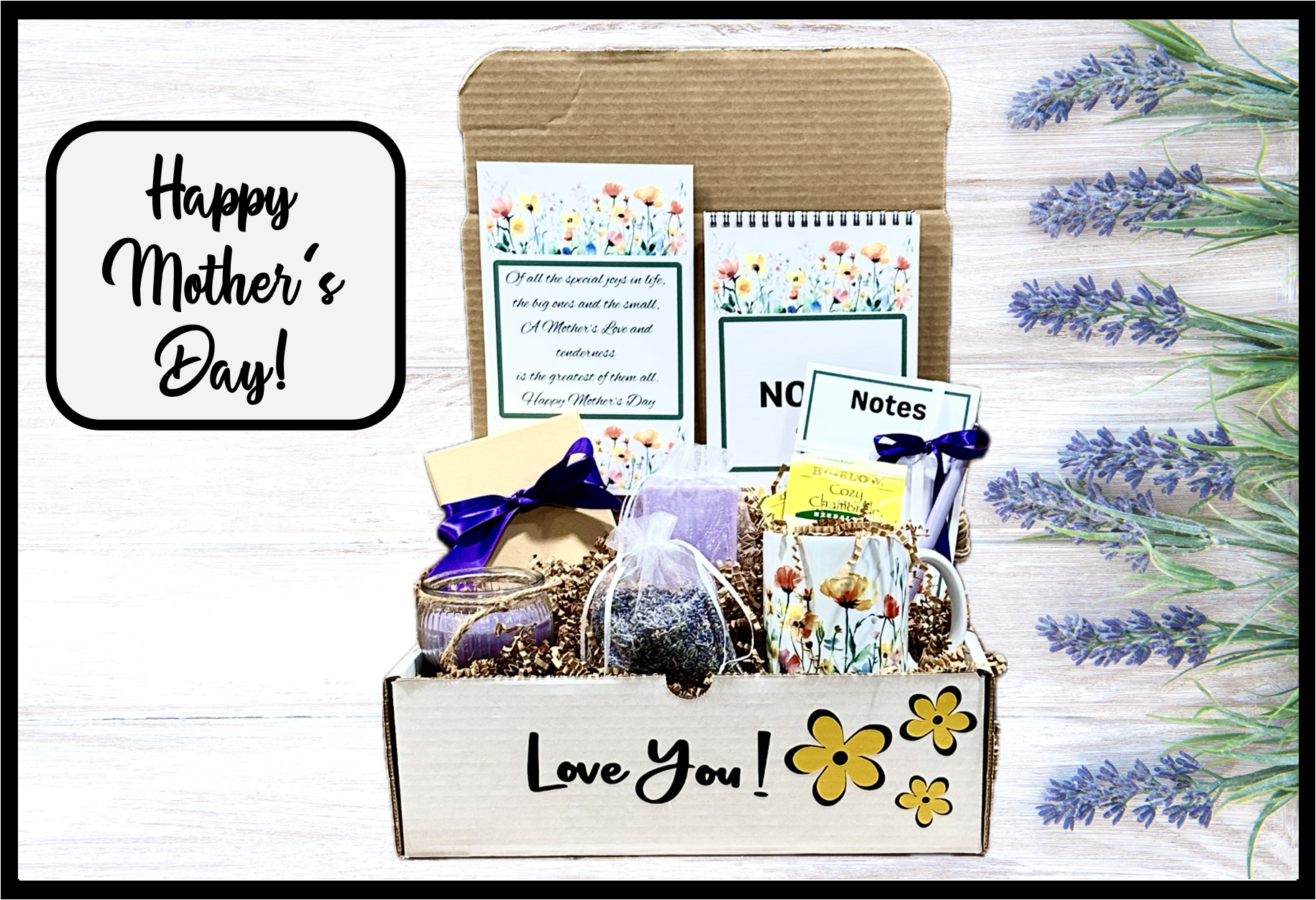 Treat Mom to a beautifully crafted gift box that speaks from the heart. Thoughtfully packed with love, each item is chosen to pamper, uplift, and celebrate her. Inside, she’ll find self-care essentials like a soothing lavender scented candle, luxurious bar of lavender soap, relaxing lavender shower steamers, a fragrant lavender sachet that will keep her clothes and linens smelling fresh, floral coffee mug with calming chamomile herbal tea bags, two handcrafted notepads , a stylish gel pen, and a sweet card just for her. It’s not just a gift—it’s a heartfelt “thank you” for everything she does.